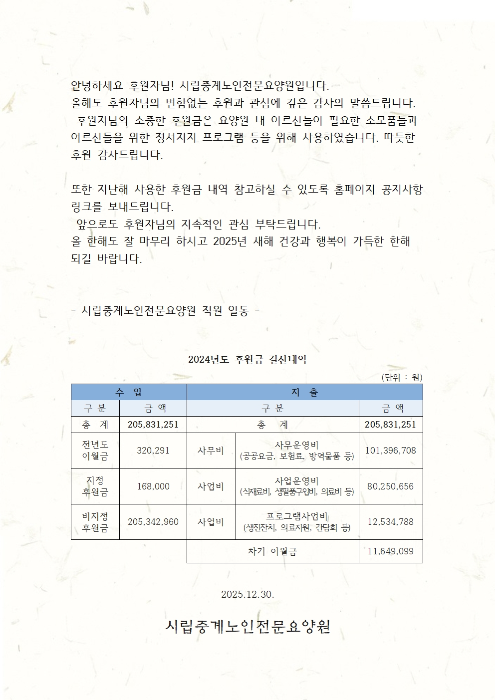 2025년 후원자 감사 편지 내용과 2024년 결산내역 공지합니다.